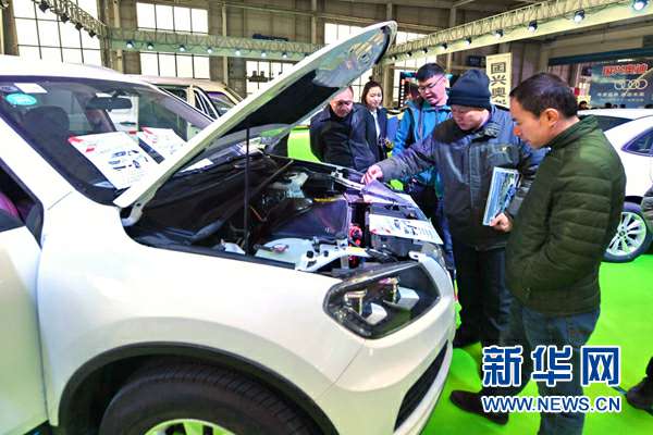 消费者在吉林长春国际会展中心举行的2017长春新能源汽车展览会上参观选购新能源汽车(2017年12月8日摄)。新华社记者 张楠 摄